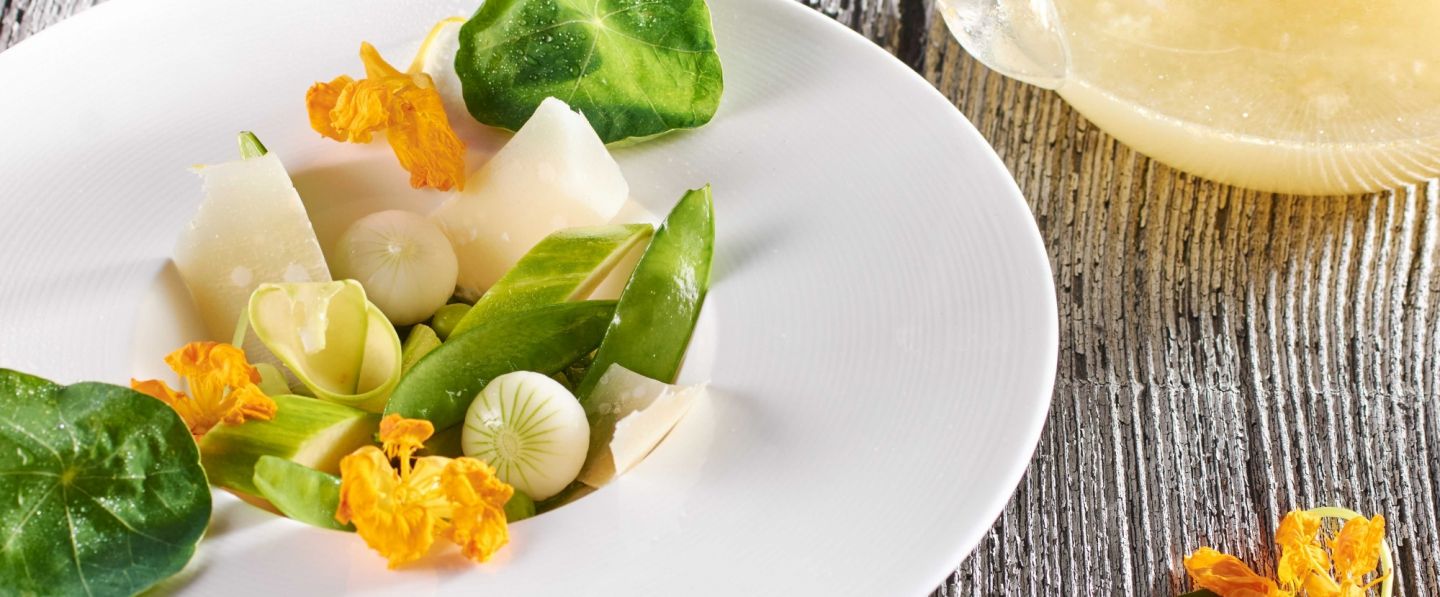Déposer la purée de roquette au fond d’une assiette creuse. Dresser les légumes, parsemer avec trois copeaux de parmesan, les fleurs et les feuilles de capucine et de courgette. Assaisonner de fleur de sel. Dresser le bouillon végétal en saucière.
