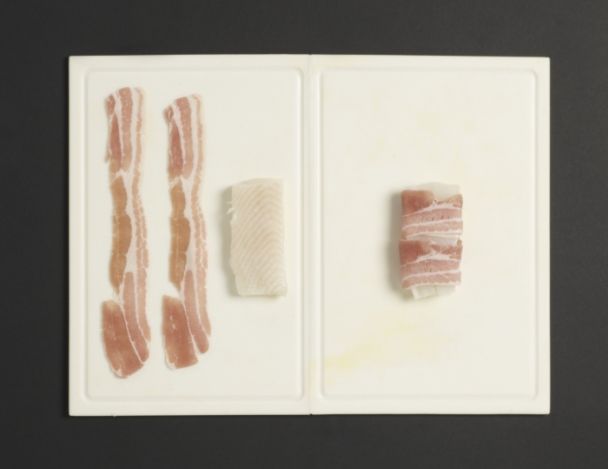 FacileMettre sur chaque pavé de merlu 2 tranches de poitrine de porc.