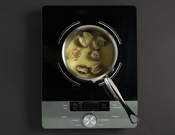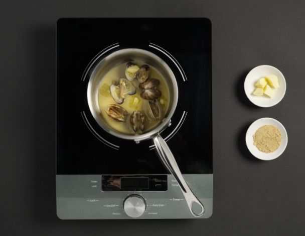 Dans une casserole, mettre 1 cl d’huile d’olive, faire colorer l’ail, ajouter les palourdes, déglacer au vin blanc une fois les palourdes ouvertes.