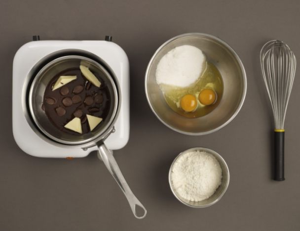 FacileBlanchir les œufs avec le sucre. Bien fouetter. Faire fondre le chocolat et le beurre au bain-marie pour réchauffer le chocolat.