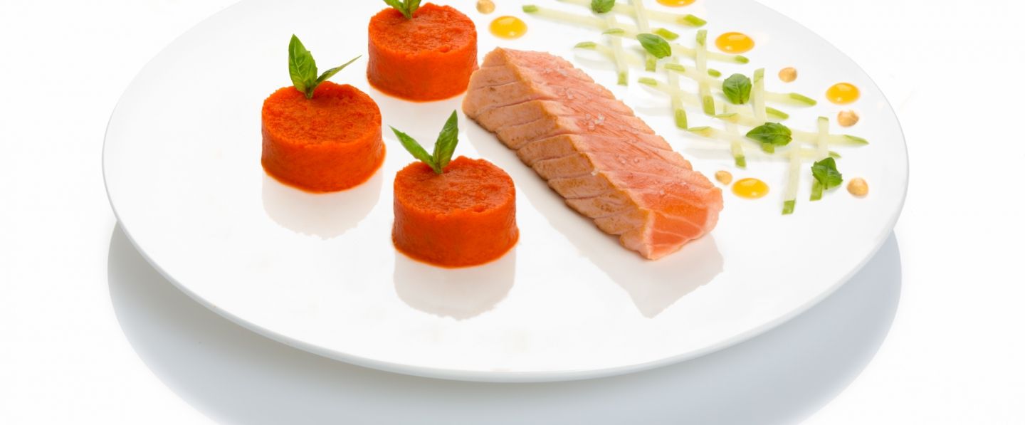 Sur une assiette plate, déposer harmonieusement le saumon et la purée. Déposer quelques points d’émulsion et de moutarde Maille. Ajouter enfin le basilic et les bâtonnets de pomme en formant des petites croix.