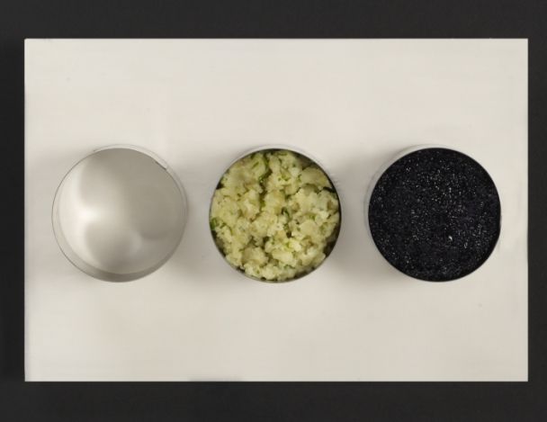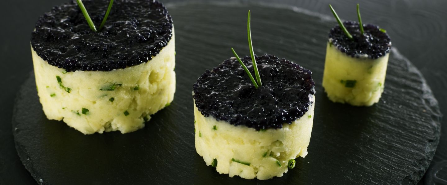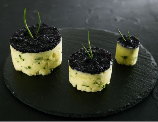 A l'aide d'un emporte-pièce rond assez haut (une dizaine de cm), mouler la préparation de pomme de terre aux trois quarts de la hauteur et compléter avec le caviar.