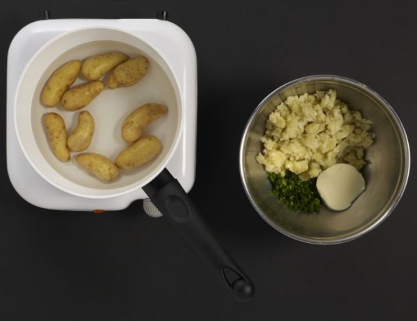 MoyenFaire cuire les pommes de terre non pelées à l'eau salée pendant environ 20 minutes (jusqu'à ce qu'une lame les traverse aisément). Egoutter, éplucher puis les écraser grossièrement à la fourchette. Mélanger avec le beurre et la ciboulette finement ciselée. Saler et poivrer.