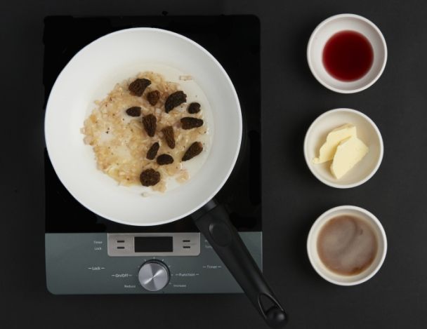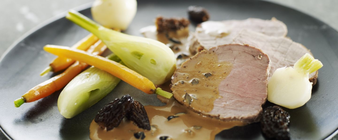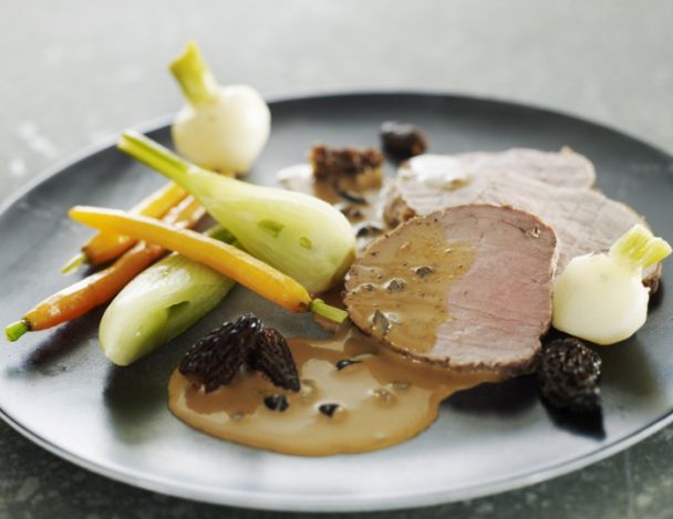 Suer les échalotes au beurre, ajouter les morilles, assaisonner légèrement. Déglacer au Banyuls, réduire à sec et ajouter le fond de veau, réduire à consistance, monter au beurre et rectifier l’assaisonnement.