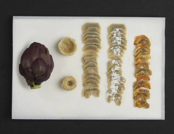 Tourner les artichauts en ne conservant que le fond, trancher à la machine à 2mm, fariner et frire à 170°C. Absorber la graisse sur un papier absorbant, saler et réserver au chaud.
