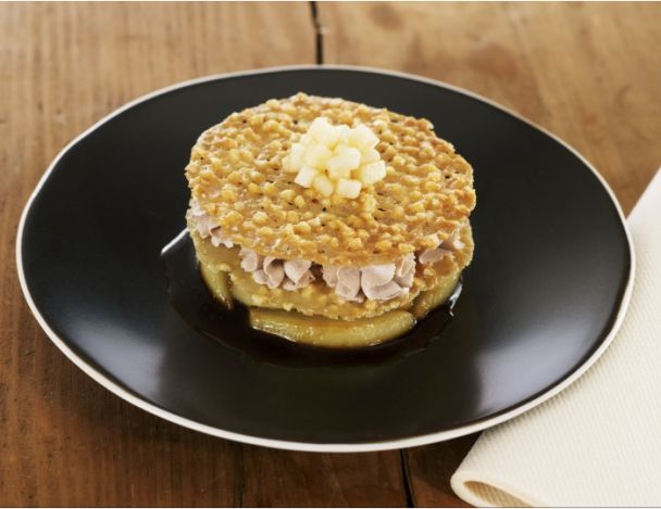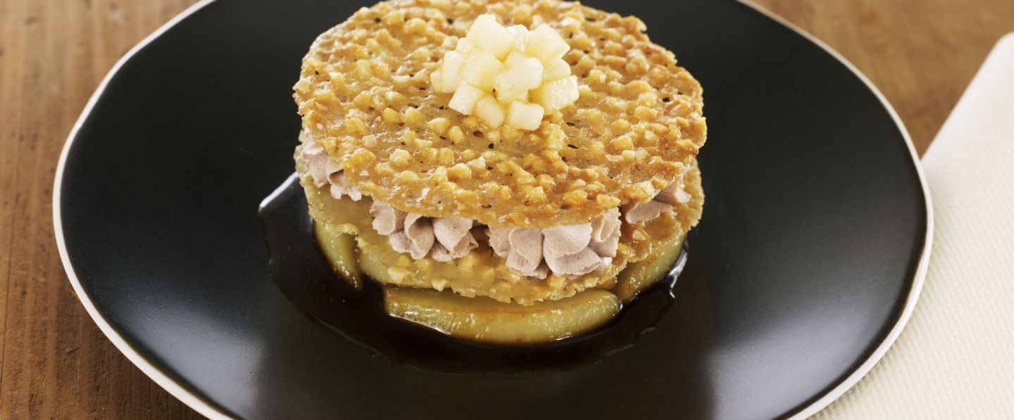 Superposer les différents éléments: poires, tuiles amandes, crème chantilly au chocolat au lait pour former un millefeuille.