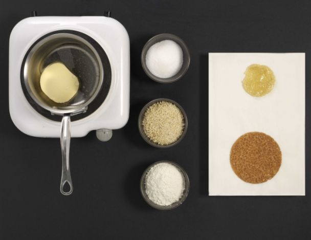 Faire fondre le beurre avec le sirop de glucose, ajouter le sucre semoule, la farine puis les amandes hachées. Etaler l’appareil en forme de cylindre puis laisser refroidir. Mettre un disque d’appareil à tuile sur un silpat ou une plaque téfal. Cuire au four à 160°c jusqu’à coloration. Laisser refroidir légèrement puis décoller.