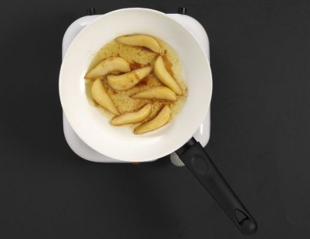 Eplucher les poires, couper en quartiers puis les poêler avec beurre et sucre. Faire caraméliser puis déglacer avec l’eau et le jus de citron.