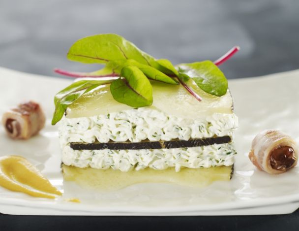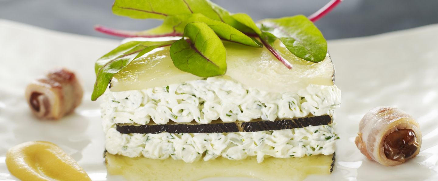 Disposer le coulis en traits sur le fond de l’assiette puis faire le montage du millefeuille ricotta/manchego en superposant les éléments. Disposer les dattes sur chaque assiette et décorer avec quelques pluches de cerfeuil ou autre pousses.