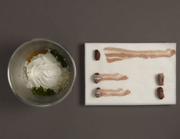 Rouler les dattes dans une lamelle de lard puis les mettre au four pendant 2 minutes à 180°C.