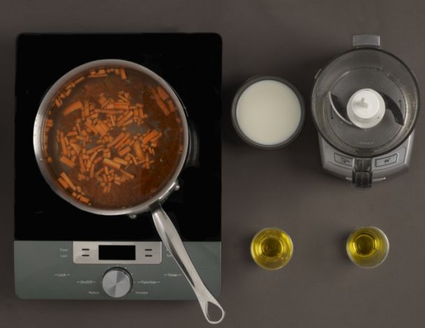 Eplucher et tailler finement les carottes puis les cuire à l’eau salée jusqu’a ce qu’elles soient fondantes. Enlever la moitié de l’eau et mettre la crème. Cuire 5 minutes maximum. Mixer au bol mixeur et garder au frais dans le bol. Une fois refroidi, monter le coulis avec les deux huiles puis rectifier l’assaisonnement.