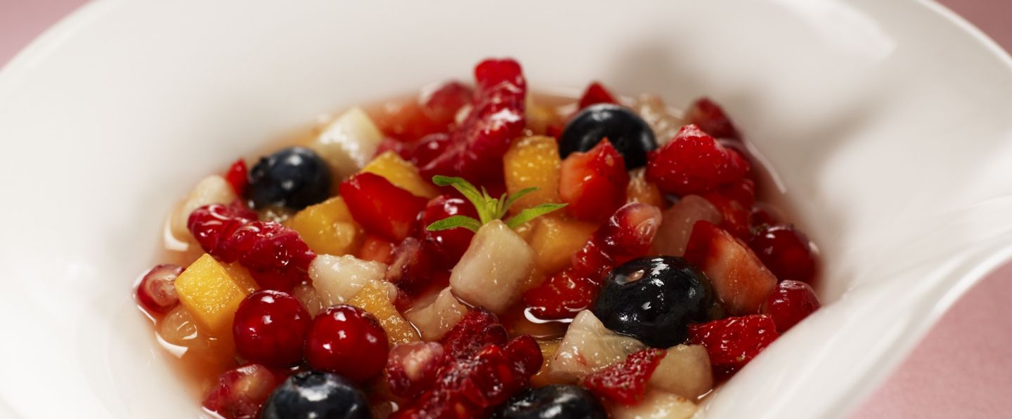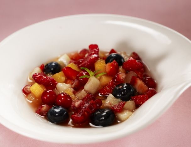 Un minestrone est traditionnellement une soupe de légumes épaisse de la cuisine italienne. Le chef a élaboré une variante sucrée de ce plat, à base de fruits infusés dans un sirop de verveine. Résultat léger et fleuri !