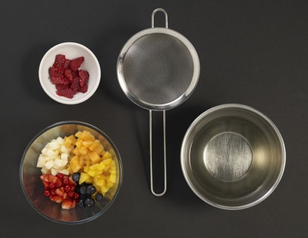 Tailler tous les fruits (sauf les framboises) en brunoise. Réserver dans un saladier. Couper les framboises en 2 si elles sont petites sinon en 4. Les réserver à part. Verser le sirop filtré sur les fruits et laisser au frais à nouveau pendant une heure