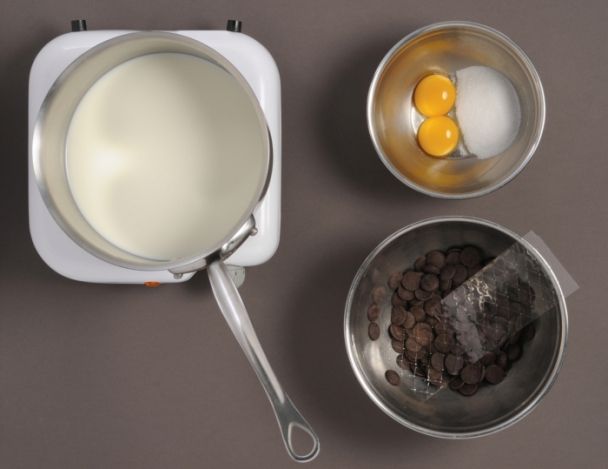 Faire bouillir le lait et la crème. Mélanger les jeunes d’œuf et le sucre. Verser le liquide bouillant sur la base jaune d’œuf et sucre. Cuire comme une crème anglaise. Ensuite verser sur le chocolat avec une feuille de gélatine. Bien mélanger et réserver au frigo avec un papier film au-dessous, pendant 2h. Pour le dressage, mettre dans une poche.