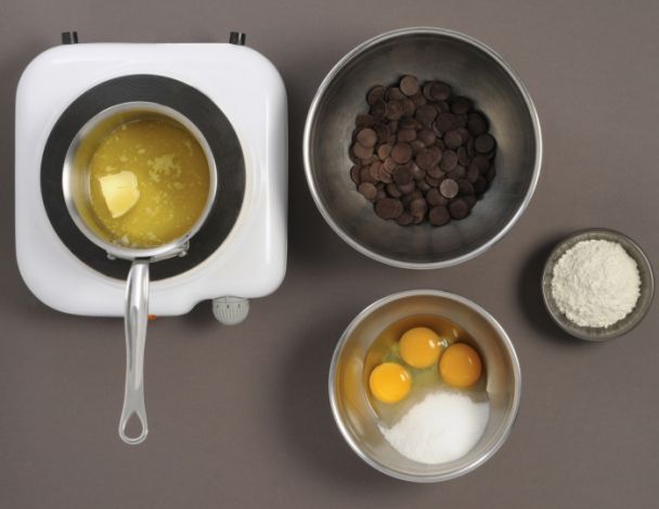 Mélanger le sucre et les oeufs entiers ensemble. Ensuite faire fondre le beurre et le déposer sur le chocolat noir à 70%. Bien mélanger. Incorporer les œufs sucrés à la base chocolat – beurre et terminer avec 80 g de farine. Mettre au frigo pendant 1 heure.