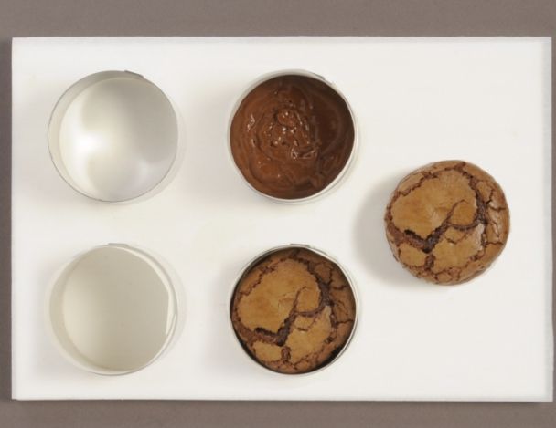 Mouler dans des emporte-pièces avec papier sulfurisé, la préparation du moelleux au chocolat. Enfourner au four à 180°C pendant 12 à 16 minutes et le laisser reposer pendant 2 minutes à la sortie du four. Ensuite le démouler.