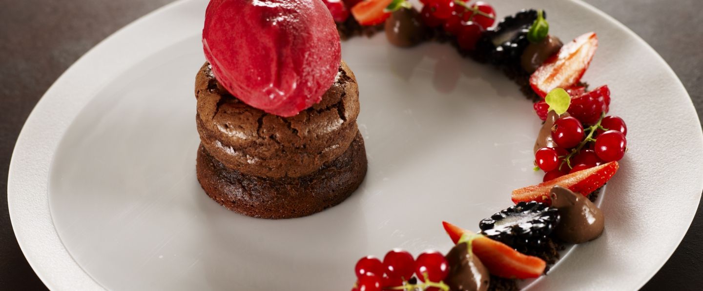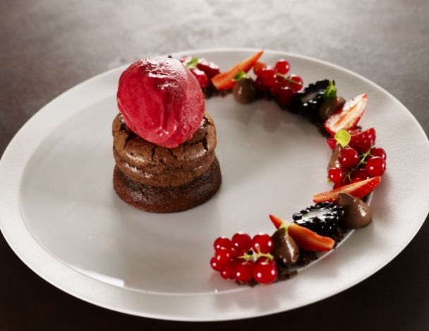 Déposer sur le bord de l’assiette un peu de crumble au chocolat. Mettre des point de chocolat à l’aide de la poche et y incorporer les fruits rouges découpés en quartier. Disposer le moelleux au milieu de l’assiette et déposer la boule de sorbet framboise au milieu.