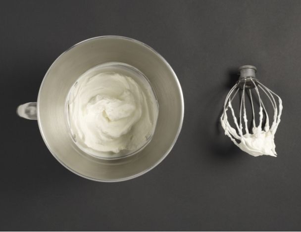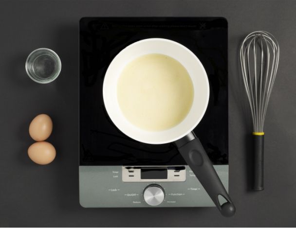 Fouetter les œufs sur un feu doux jusqu’à ce qu’il mousse et triple de volume.