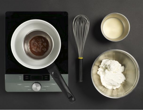 Faire fondre doucement le chocolat dans un bain-marie. Mélanger cette écume d’œuf au chocolat, puis à la crème.