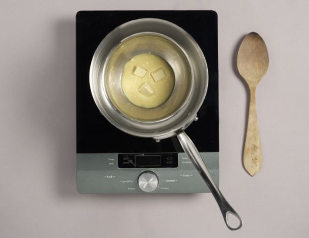 Couper le chocolat blanc en petits morceaux, puis le faire fondre au bain marie ou au micro-ondes.