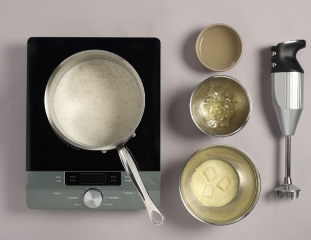 Dans une casserole, faire bouillir le lait, la purée et l'alcool de litchis.