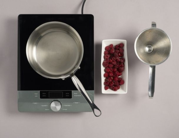 Faire un sirop avec 20g de sucre et 10 cl d'eau. Ajouter une barquette de framboises et laisser cuire 1/2h à feu doux. Passer au chinois étamine, réserver au frigo.