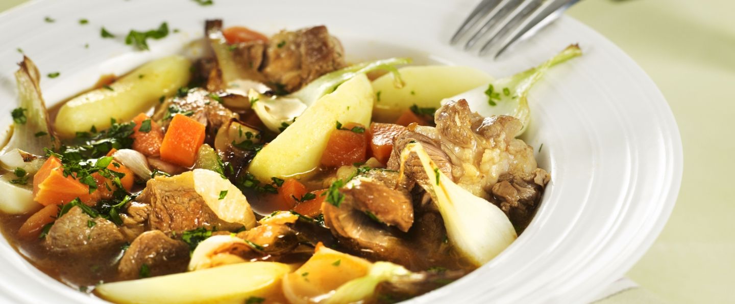 Une fois les pommes de terre cuites, éteindre le feu. Préparer un bol à demi rempli d'eau froide. Ajouter une petite louche d'eau froide sur toute la surface du ragoût et, avec la louche, retirer la graisse qui va affleurer, en rinçant la louche dans le bol à chaque passage. Poser les petits oignons par-dessus, parsemer de persil.