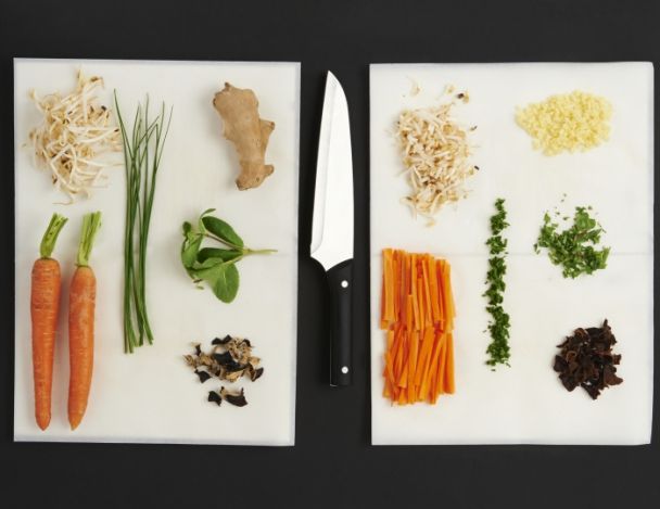 MoyenTailler tous les légumes en julienne: carottes, pousse de soja, champignons.