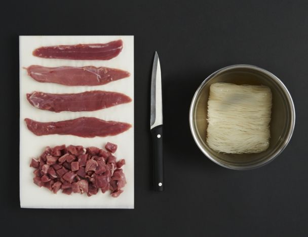 Tailler le filet en brunoise et laisser tremper 2h les vermicelles dans l’eau
