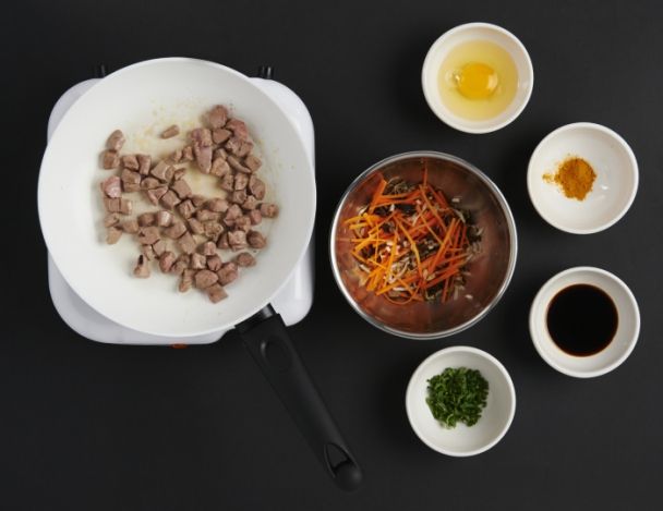 Suer la viande à l’huile, ajouter la julienne de légume, l'ail, le sucre, sel, piment oiseau.