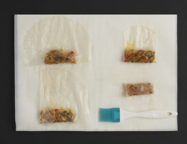 Garnir chaque galette de riz avec une cuillère de préparation. Refermer les bord et rouler en serrant bien. Souder a l'aide d'un pinceau, avec un mélange d'eau et de fécule.