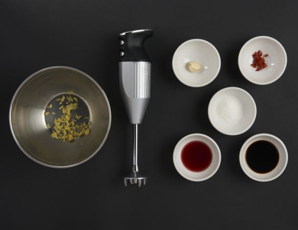 Mixer le gingembre, l’ail, le piment et le sucre avec le vinaigre, la sauce soja. Émulsionner avec l’huile.