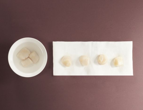 MoyenLaver les noix de St Jacques à l'eau glacée, puis les éponger sur une serviette.