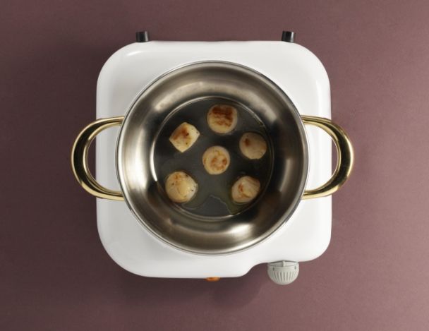 Saler les noix de St Jacques et les faire cuire à feu vif dans une poêle anti-adhésive avec une goutte d'huile d'olive. 1 min de chaque coté.