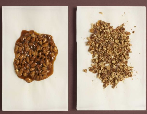 Verser le sucre dans une casserole et ajouter de l'eau à hauteur. Faire cuire ce sirop à 121 °C (vérifiez avec le thermomètre à sonde). Lorsque la température est atteinte, verser les amandes encore chaudes (sinon la nougatine va figer trop vite). Remuer à la spatule en bois : une masse se forme. Poursuivre la cuisson jusqu'à ce que les amandes soient caramélisées individuellement.