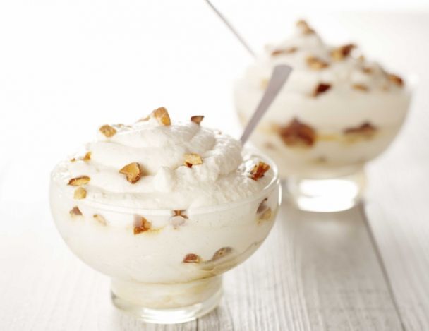 Mélanger délicatement la meringue italienne refroidie et la crème fouettée. Incorporer les amandes concassées. Garnir une poche à douille et remplir des petites coupes à placer au congélateur.