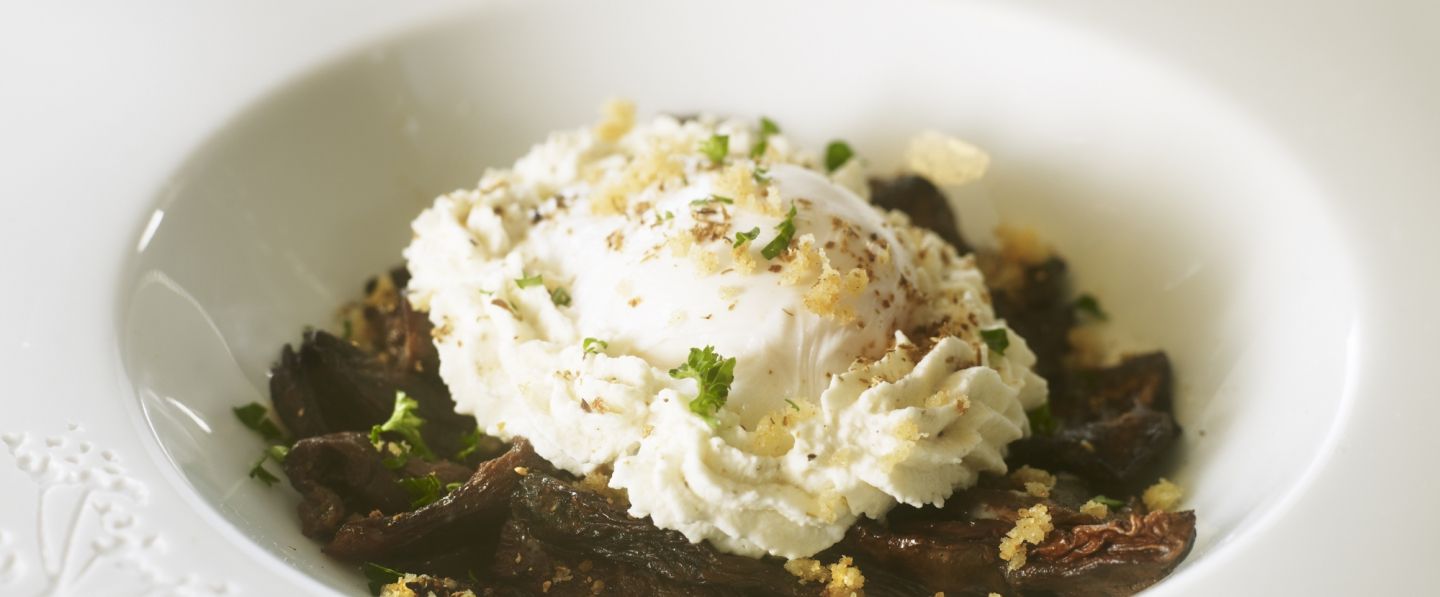 Dans une assiette creuse, déposer au centre les cèpes sautés, une pincée de pain frit. Déposer dessus l'œuf préalablement écaler. Entourer l'œuf à l'aide du siphon avec la crème. Saupoudrer de cèpes, de persil ciselé et de poudre de pain frit