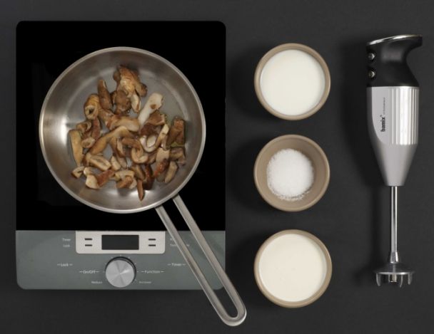 Mélanger le lait, la crème, le sel et les cèpes et cuire 15 min. Mixer au blender.