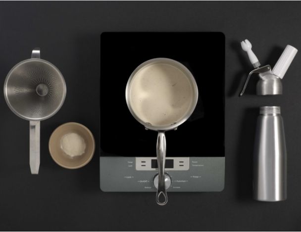 Passer au chinois, ajouter l'agar agar, puis porter de nouveau à ébullition. Disposer en siphon à chantilly. Gazer 1 fois.