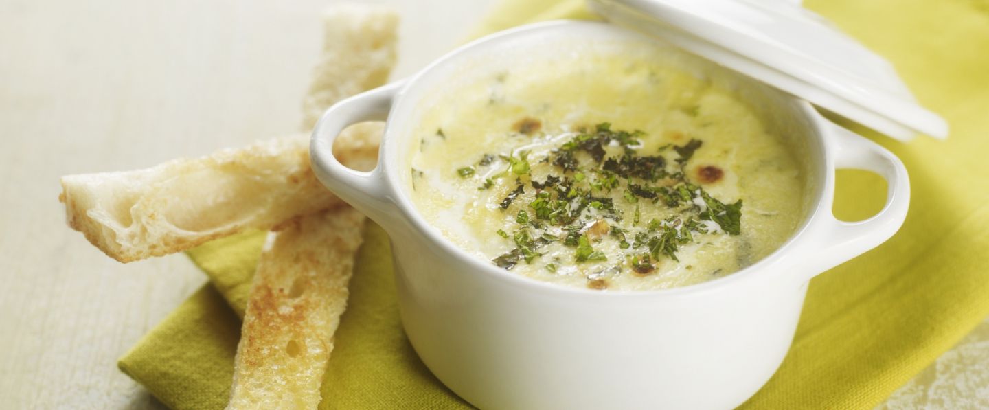 Mettre au four à 200° pendant 20mn environ. La crème doit frissonner et le dessus doit être légèrement doré. Servir avec de grandes mouillettes de pain légèrement toasté.