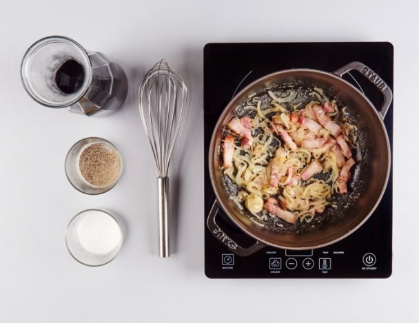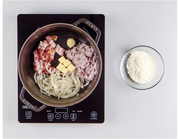 FacileFaire revenir les lardons avec le beurre, en remuant constamment dans une casserole. Ajouter l'ail, les oignons et les échalotes émincées finement. Mélanger 2 minutes, poudrer de farine et remuer encore 2 minutes.