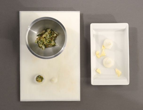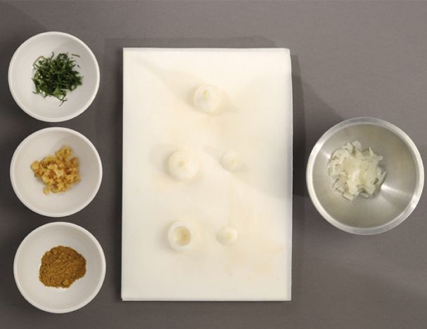Écraser l'intérieur des oignons à la fourchette et le mélanger avec le ras-el-hanout, les deux feuilles de menthe ciselées et les raisins secs hachés. Rectifier l'assaisonnement.