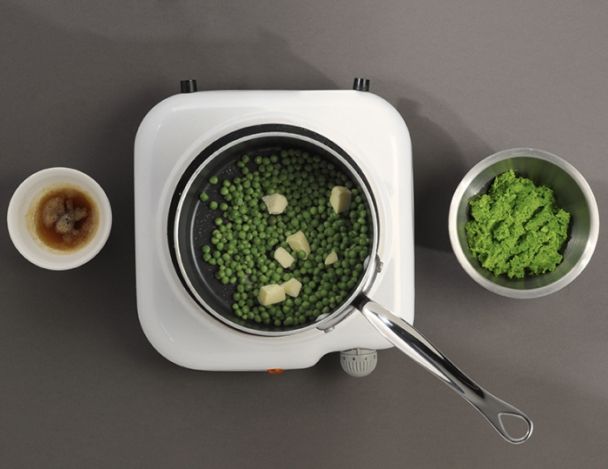 Pendant ce temps, faire cuire les petits pois avec 50g de beurre, du sel et du sucre. Parallèlement, préparer un beurre noisette en faisant fondre le restant de beurre dans une petite casserole, et en l'amenant à une coloration dorée. Mixer ensuite les deux préparations.