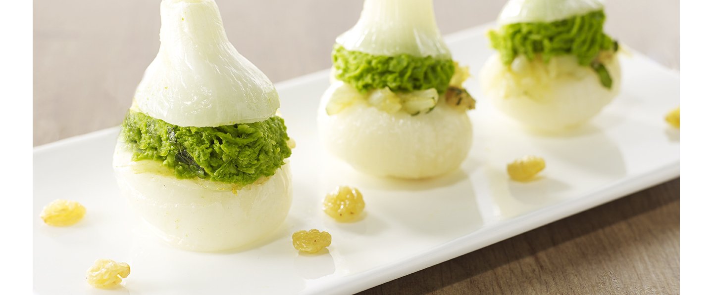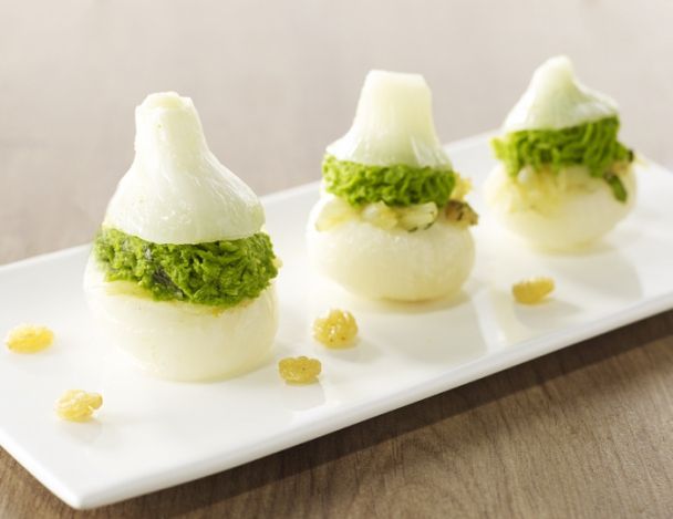 Quand les oignons sont refroidis, déposer une cuillerée de purée de petits pois sur chacun (à la douille, c'est plus joli), puis replacer les chapeaux.