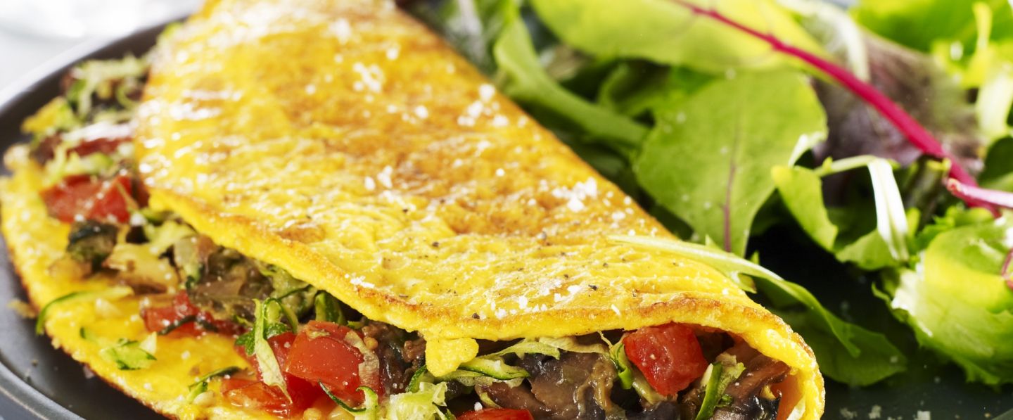 Disposer les légumes sur la moitié de l'omelette, à l'aide d'une spatule, rabattre l'autre moitié par-dessus, puis faire délicatement glisser l'omelette sur une assiette.