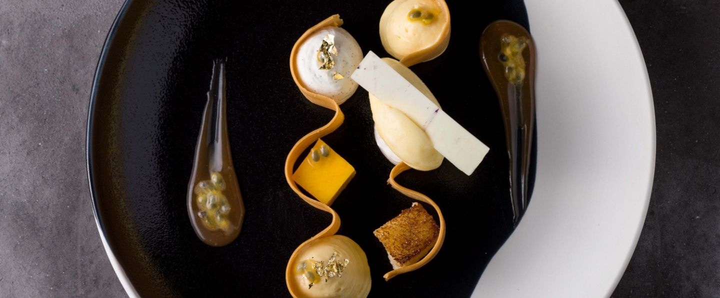 Déposez une quenelle de sorbet aux fruits exotiques et décorez avec des grains de fruits de la Passion et quelques feuilles d’or.