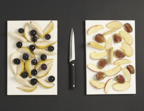Couper en quartiers les pommes et les poires. Couper les figues en deux. Détacher les raisins de la grappe.