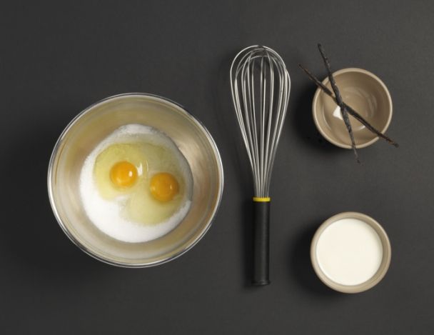 Couper en deux une gousse de vanille. Mélanger 80g de sucre avec 2 œufs. Fouetter, ajouter la crème et la gousse de vanille coupée en 2.