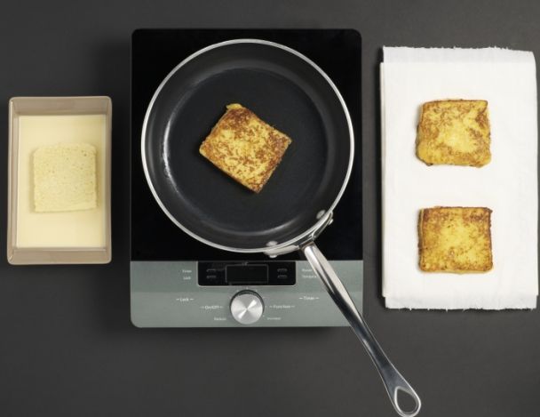 Faire tremper les brioches dans l'appareil pendant 2min. Dans une poêle anti-adhésive, mettre le restant de beurre et cuire à feu doux pendant 2min les brioches de chaque coté. Egoutter sur un papier absorbant.