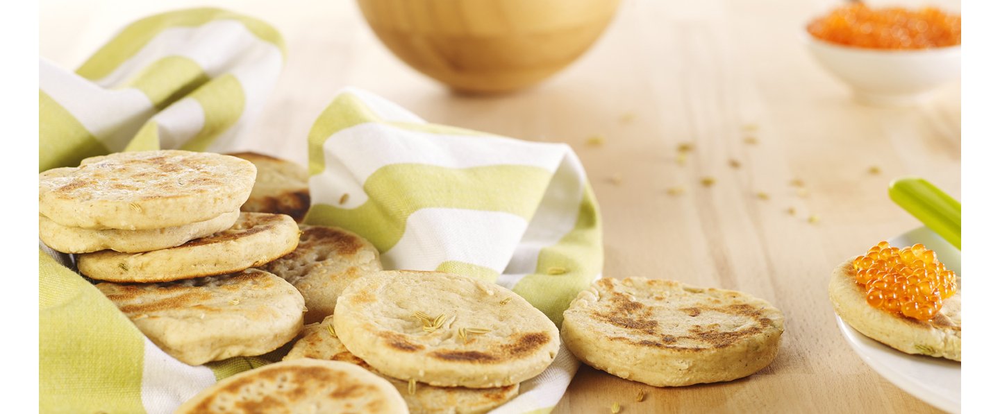Faire chauffer une petite poêle sans matière grasse et cuire les pains 2 minutes sur les deux faces sans trop les colorer. Les envelopper dans un linge après cuisson.